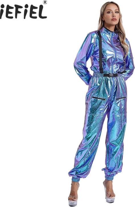 Women Silver Astronaut Costume Alien Jumpsuit Suit Space Cadet Gown Halloween Cosplay Party Dress Up
